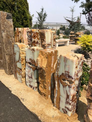 Our precious basalt water feature, onyx marble stones and granite water feature are one of a kind. Yellow onyx with red and peach colored veins, loaded with cavity pockets full of crystals Visit our landscape super store in Reno & Sparks